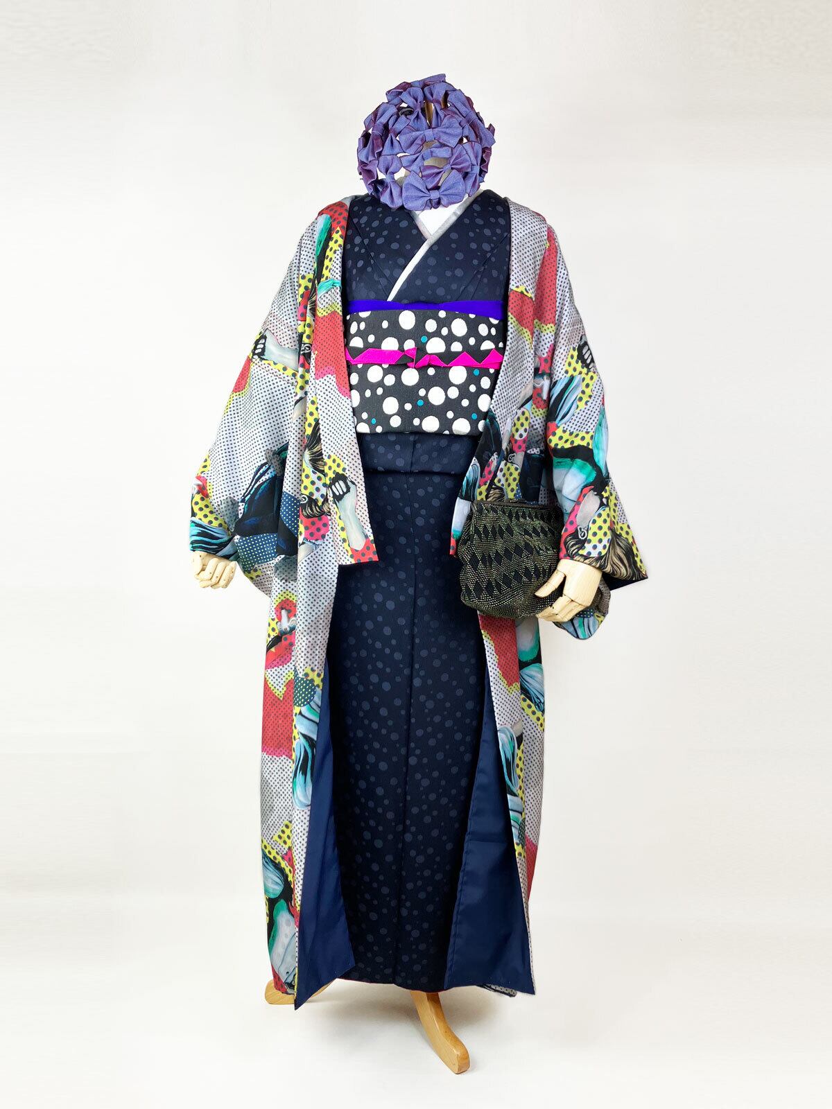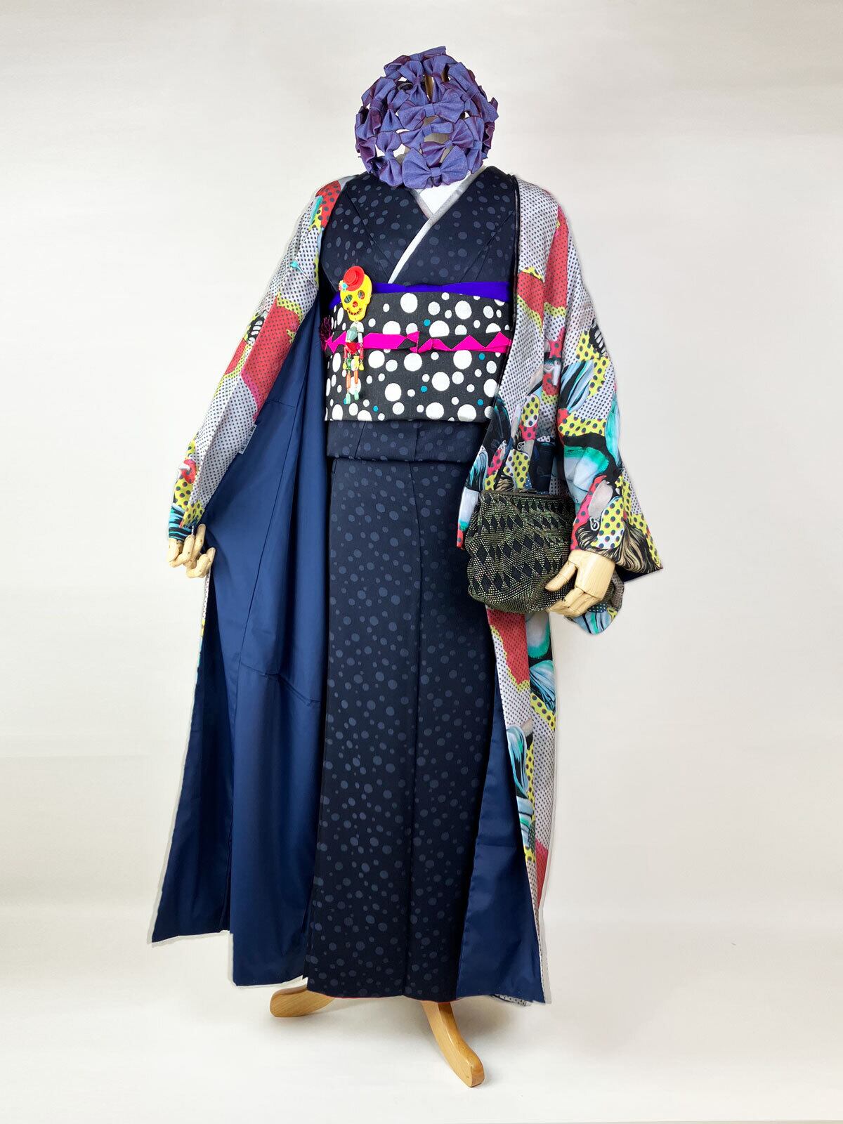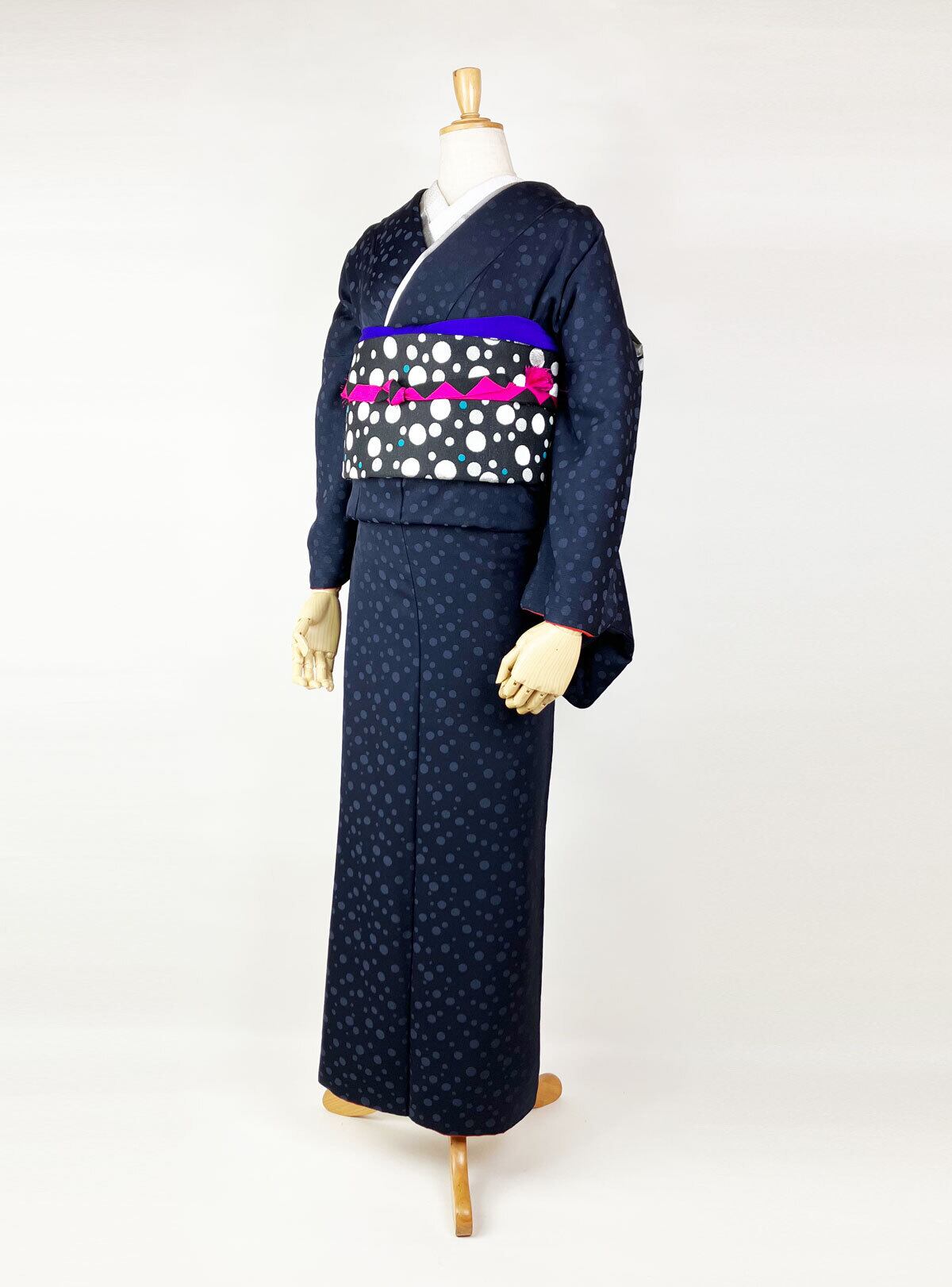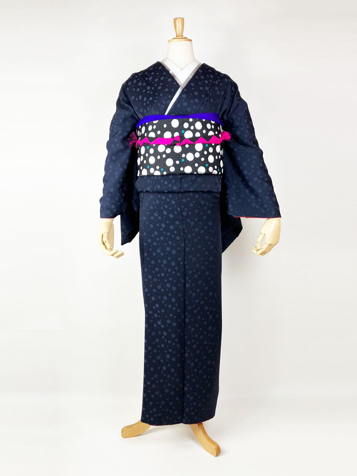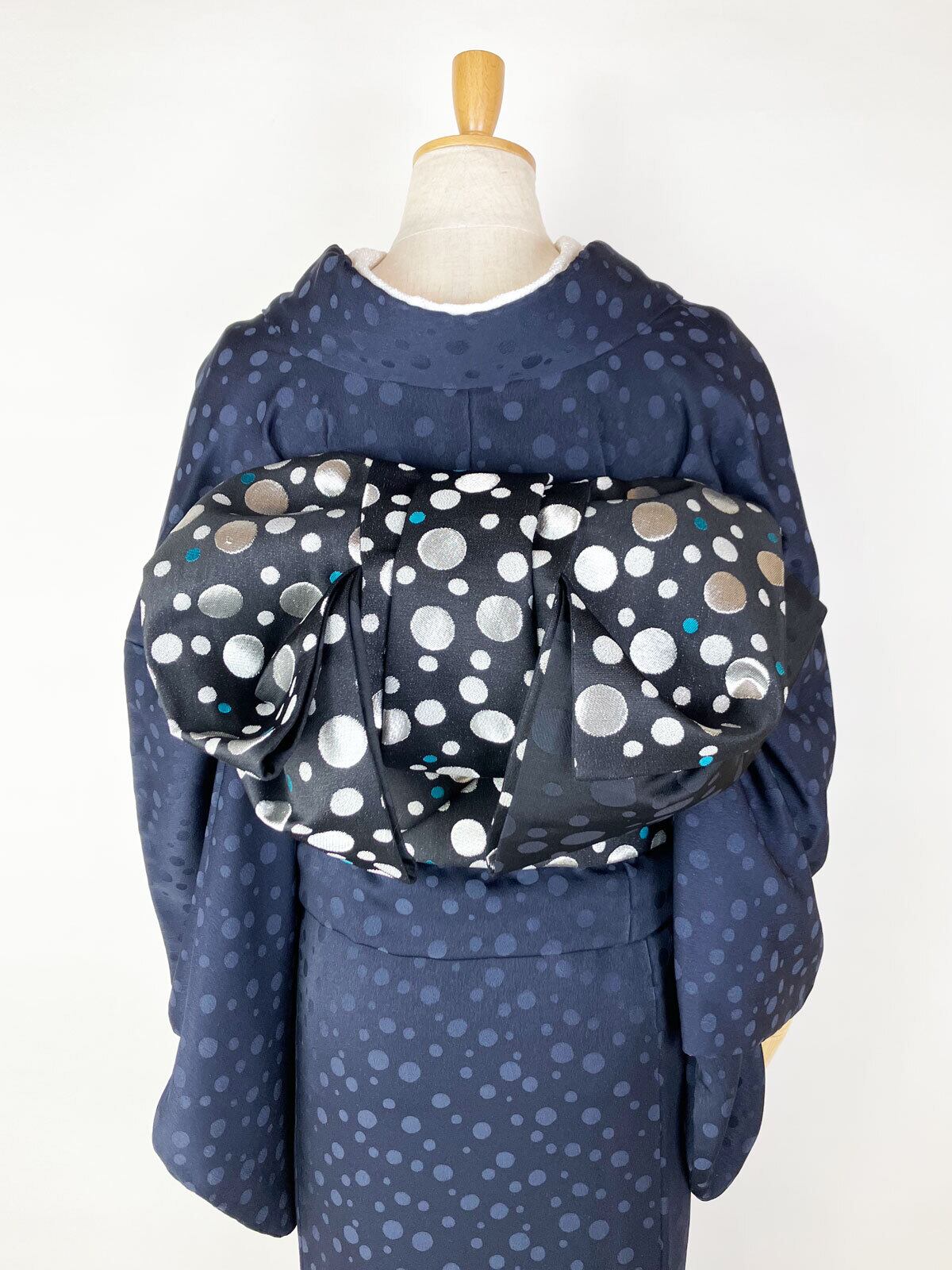 京都 西陣の織元で制作したソーダドット文様の西陣織袋帯を合わせて、レトロとモダンが共存するコーディネートに。原寸の手描きの下絵から織りデータをおこしました。