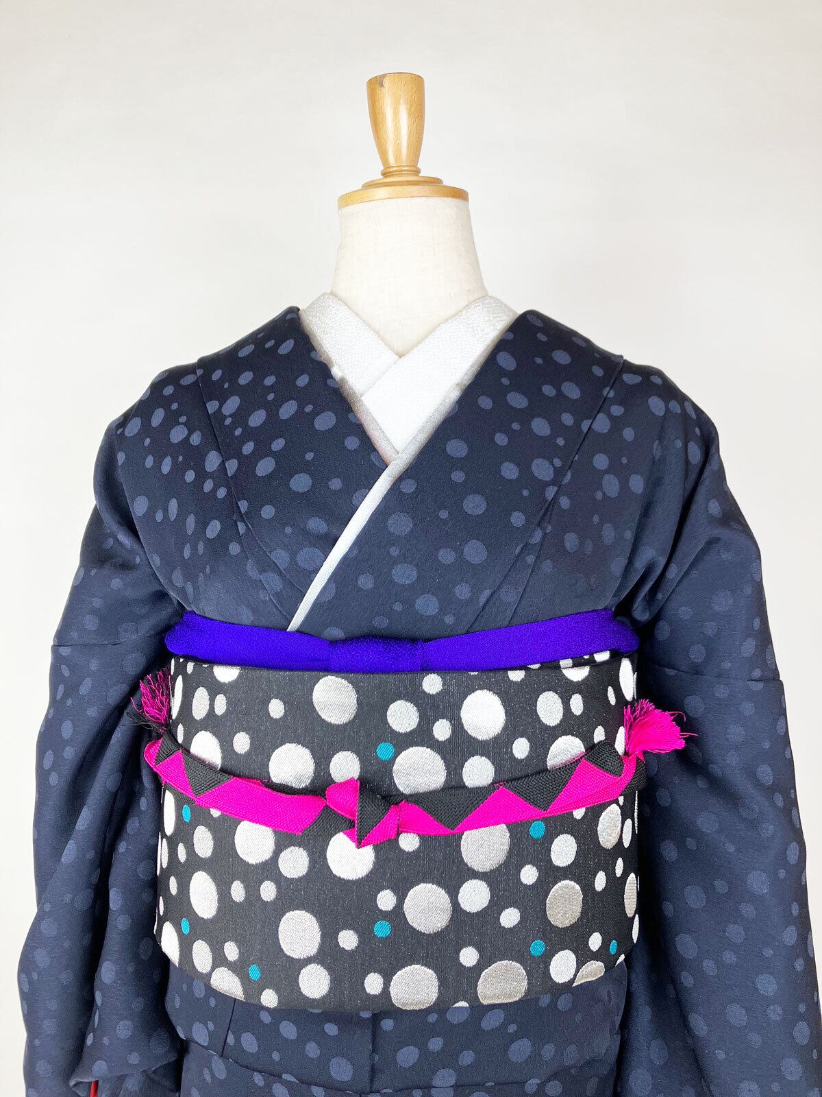 正絹と見紛うようなしっとりした艶のある、ポリエステルの水玉地紋素材をこだわりの色で無地染めしました。
