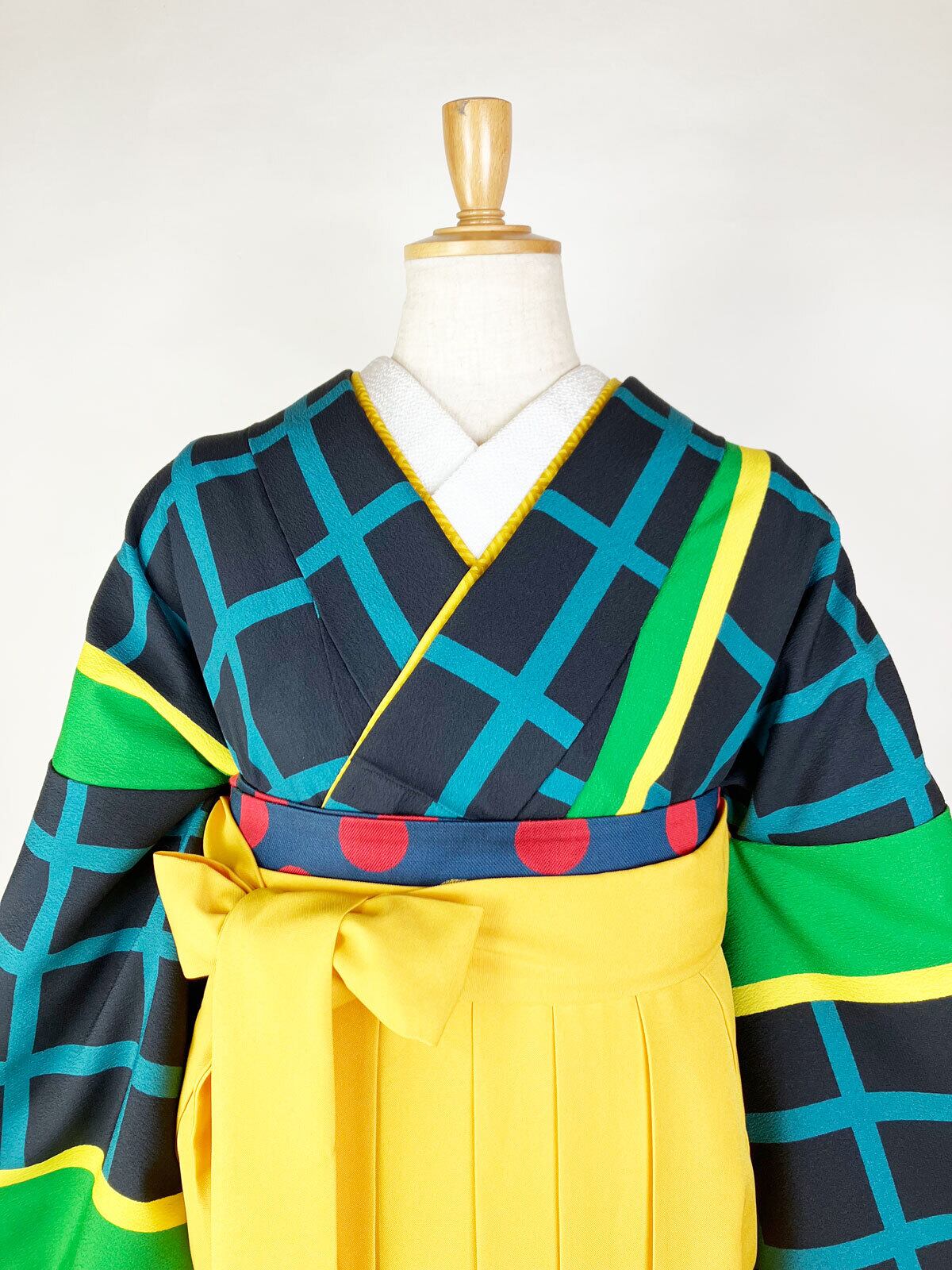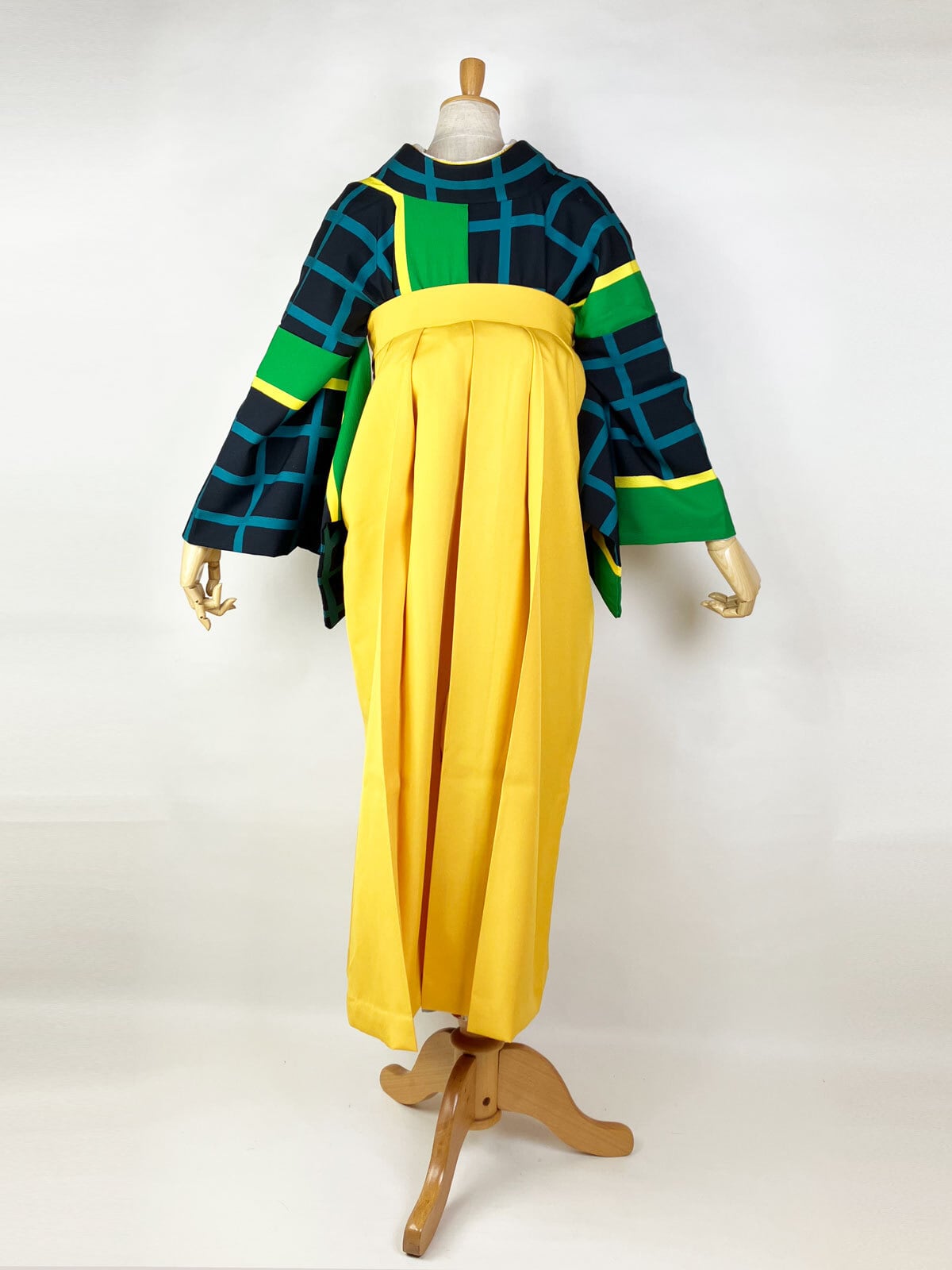 幾何学格子小紋に暖かな黄色の袴を合わせました。