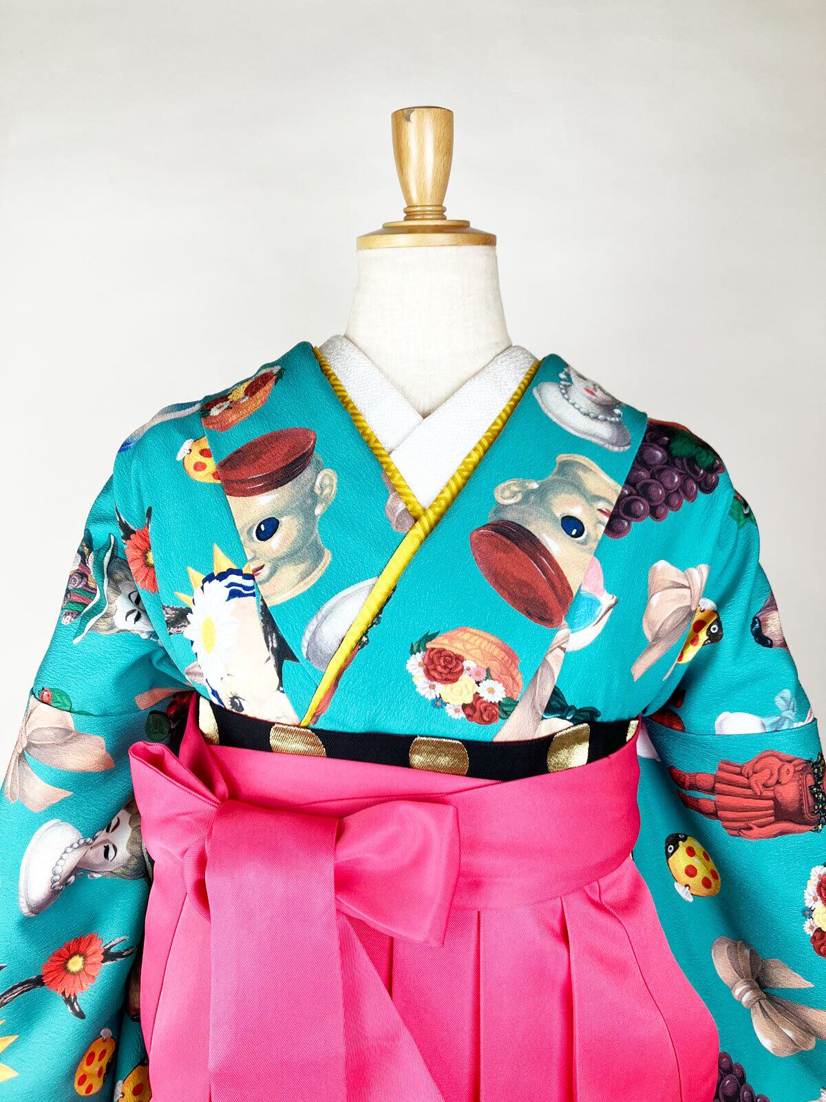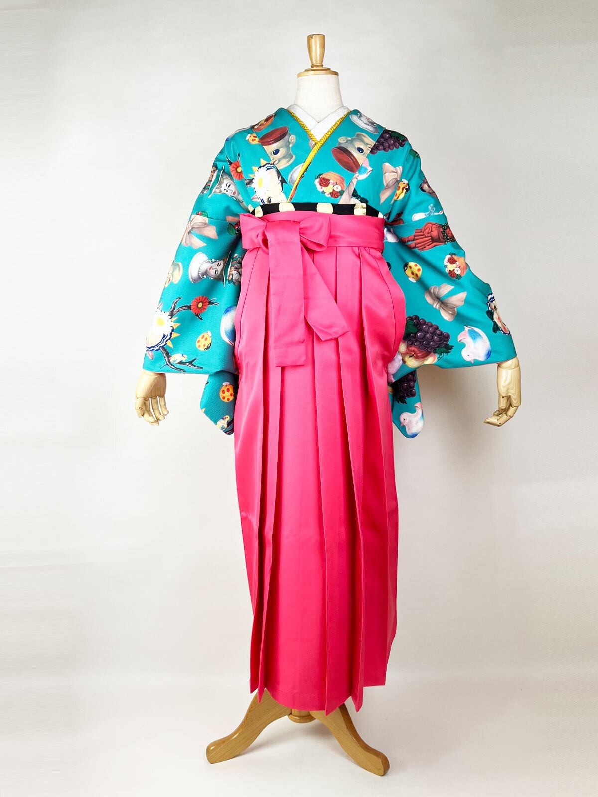 爽やかなエメラルドグリーン小紋に鮮やかなショッキングピンクの袴を合わせました。